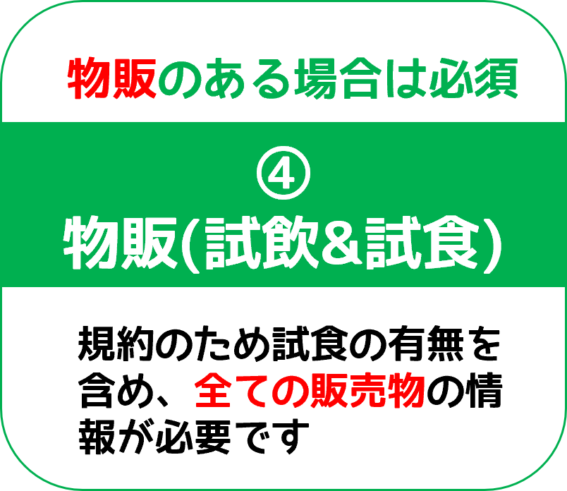 ④ マーケット・物販 | 9/19 | 物販・試食等を実施の際は必須 | ||